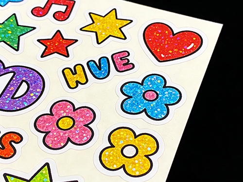 A type of sticker with a sparkling effect, usually made of materials containing sequins or glossy particles. It presents a sparkling effect under light, giving a vibrant visual impact. Advantages: Strong visual appeal, enhanced brand exposure, suitable for various occasions, good durability. Disadvantages: High price, not suitable for all surfaces.