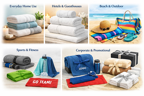 | Cotton Towels | Soft, skin-friendly, highly absorbent, breathable, and comfortable—why cotton is preferred for towels due to its natural softness, superior absorbency, and durability. Ideal for mid-budget needs. | Corporate promotional towels, hotel linens, bath towels, hand towels, tea towels. |